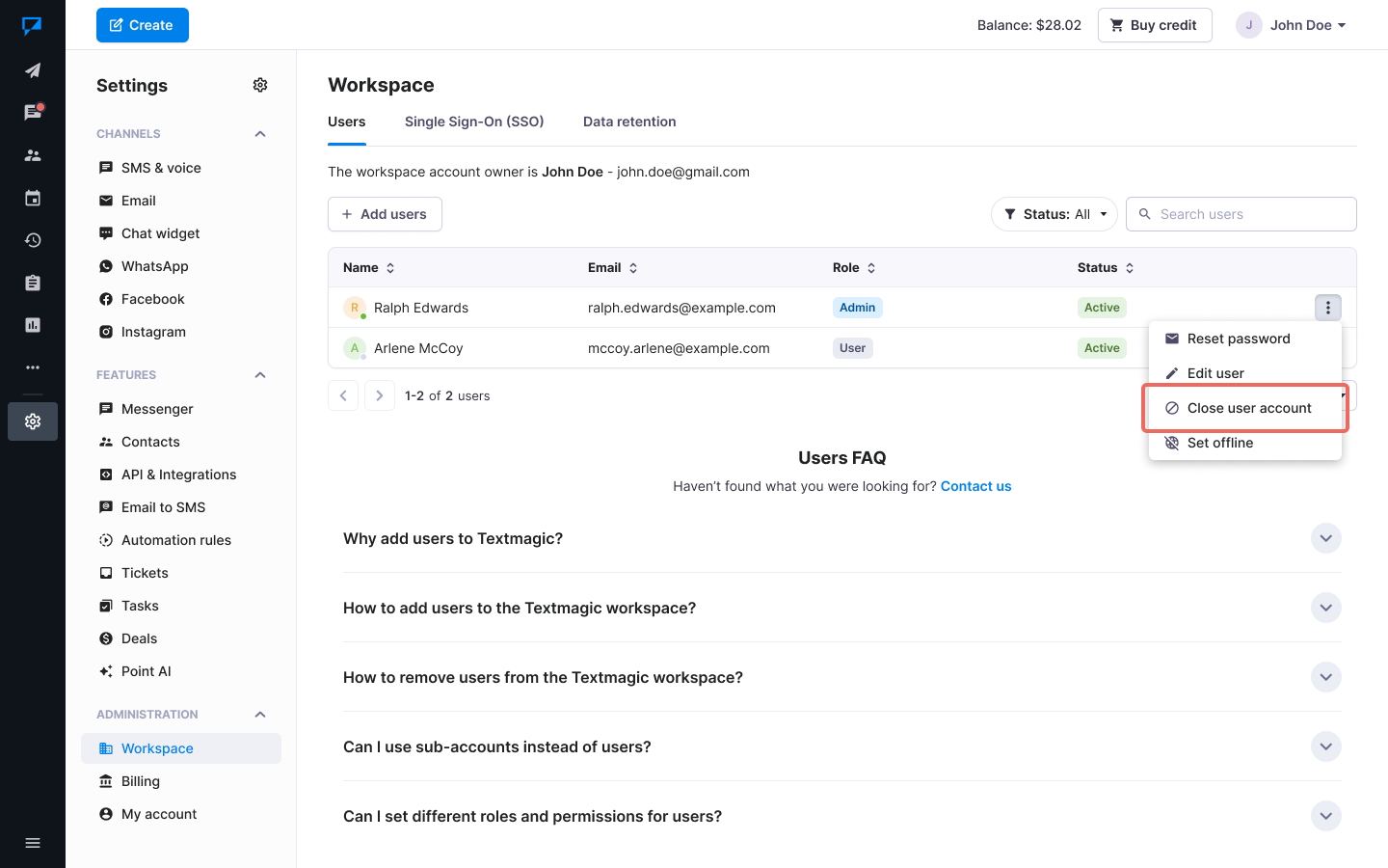 - How to remove users from the Textmagic workspace?