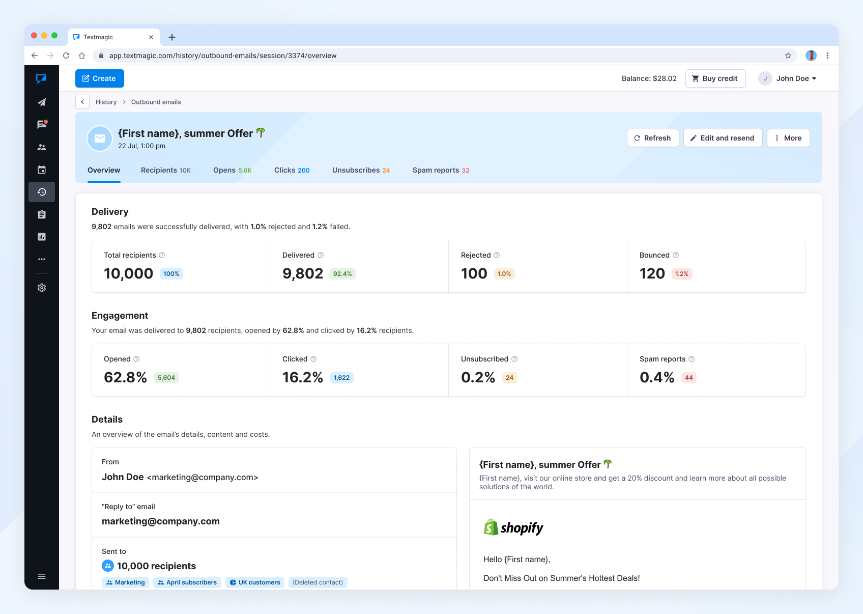 Review your email campaign performance in the Outbound emails section. If you notice sudden drops in engagement or delivery, investigate immediately.
