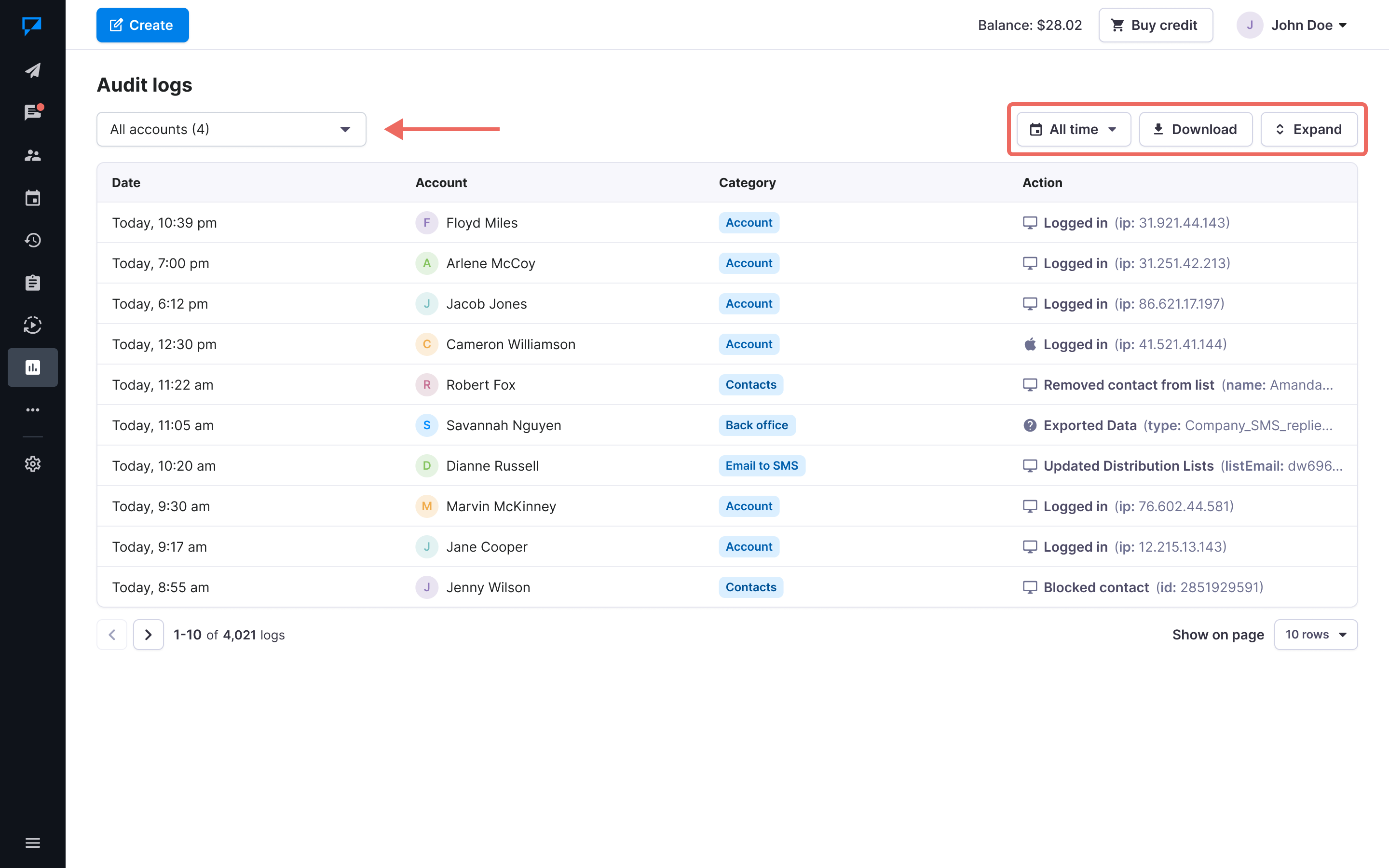 Audit logs record many actions that users can perform on the Textmagic platform. For example: