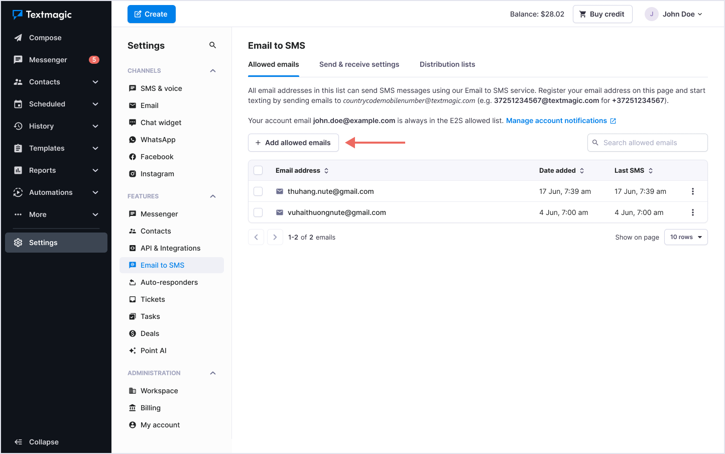 First you need to configure your Email to SMS settings and add allowed emails. These are the email addresses that are allowed to send Email to SMS messages using your Textmagic account.